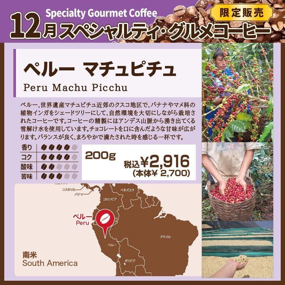 12月のスペシャルティ・グルメコーヒー ペルー マチュピチュ 焙煎珈琲豆(粉または豆を選べます) 200g 袋