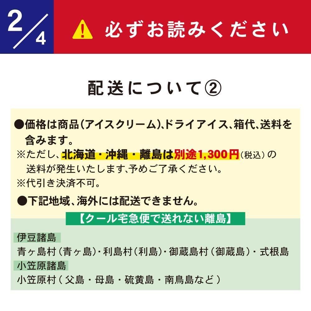 ・価格は商品(アイスクリーム)、ドライアイス、箱代、送料を含みます。(ただし、北海道・沖縄・離島は別途1,300円の送料が発生いたします、予めご了承ください。)