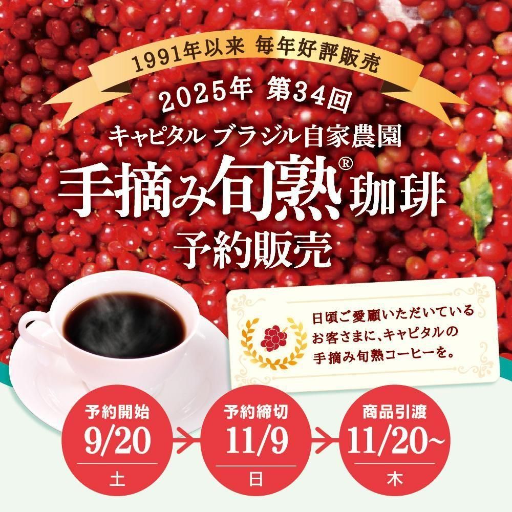 <予約商品・限定販売>2025年 キャピタルブラジル自家農園 手摘み旬熟®珈琲 ニュークロップ(新豆) 焙煎珈琲豆(粉または豆を選べます) 220g×2箱<11/20以降お届け>